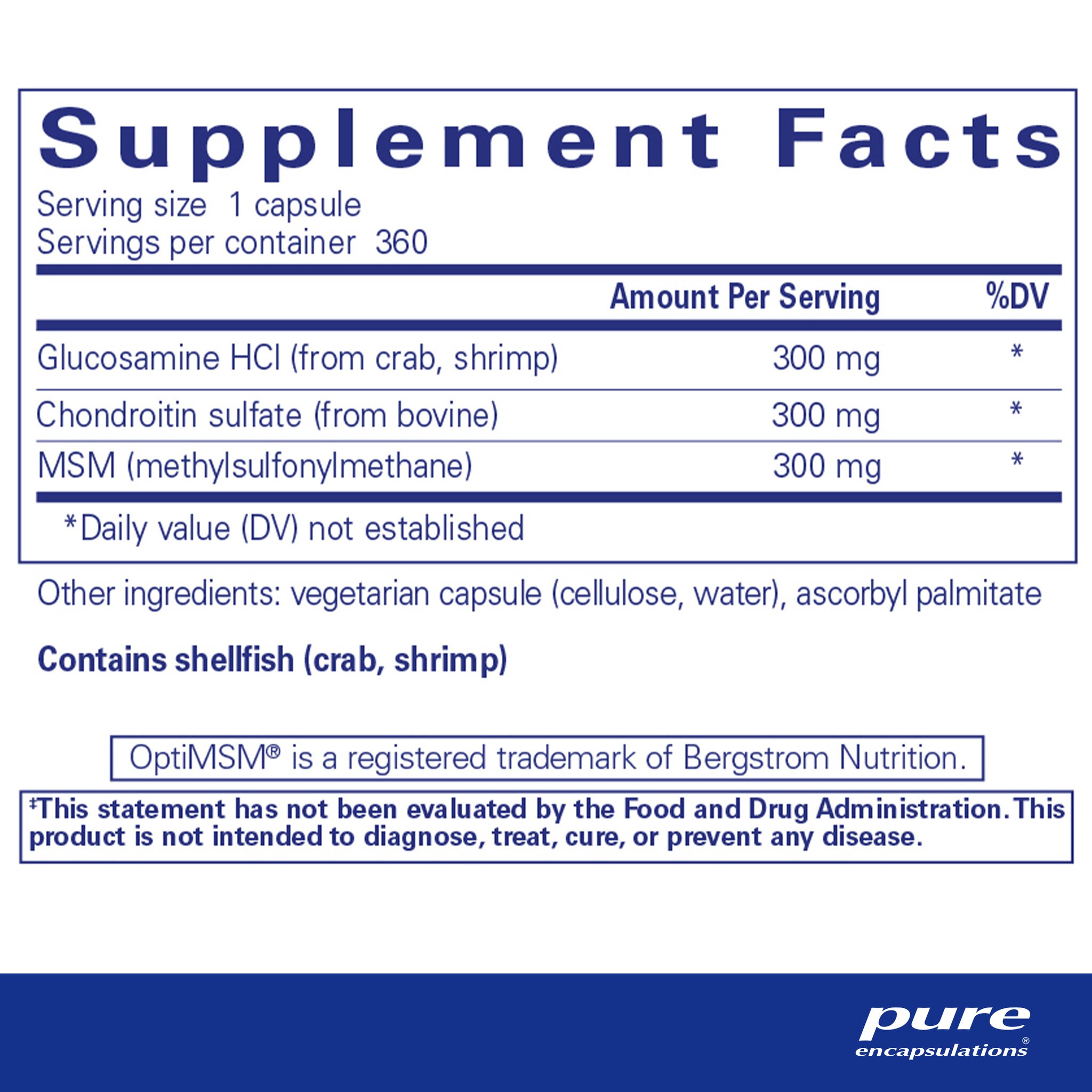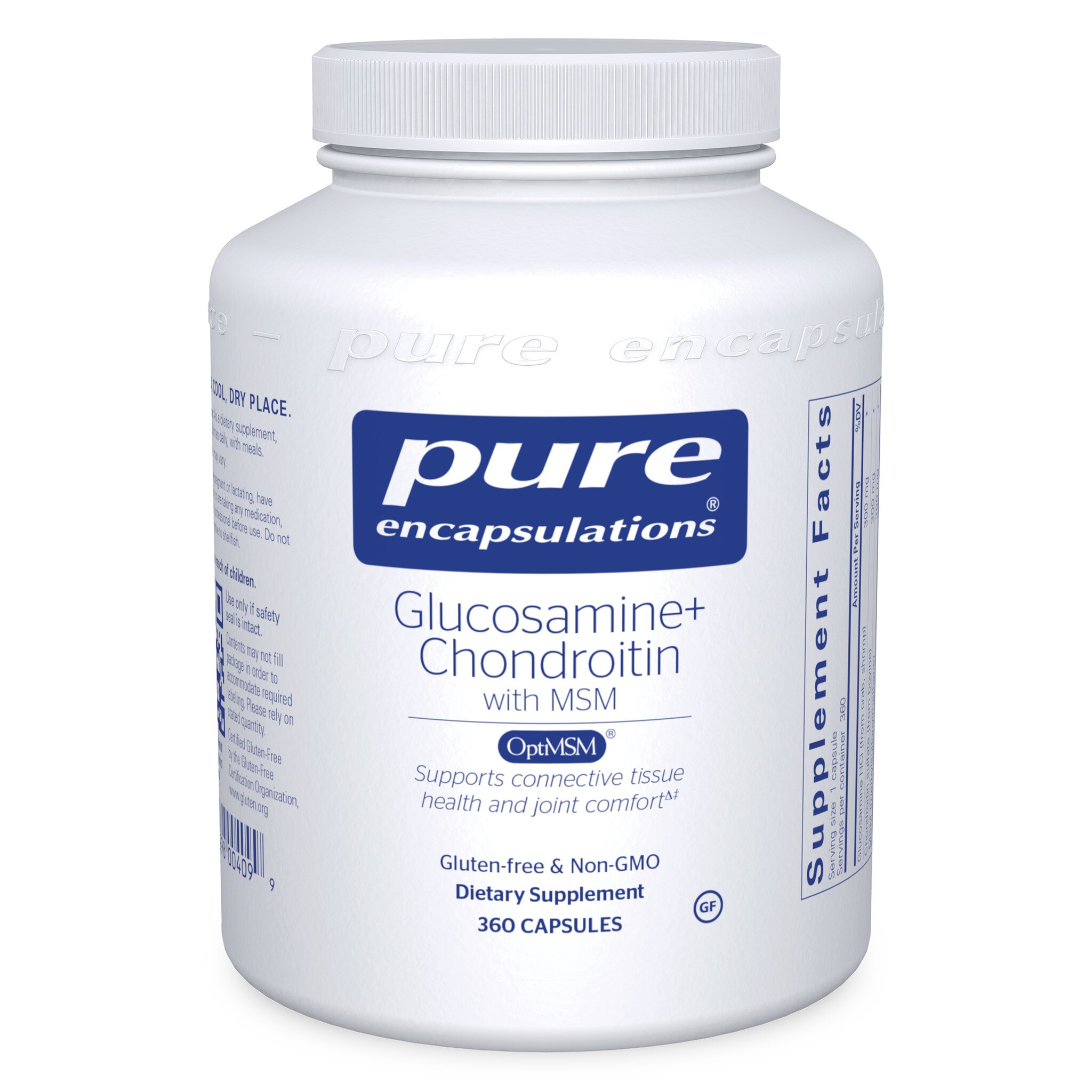 Sulfur-containing methylsulfonylmethane (MSM) is included in this glucosamine and chondroitin combination to provide an enhanced spectrum of nutrients for optimal cartilage matrix composition, connective tissue strength, and joint comfort. Glucosamine promotes the synthesis of the glycosaminoglycan chondroitin sulfate. Chondroitin sulfate is responsible for building the ground substance of cartilage, molecules known as proteoglycans. In addition, chondroitin sulfate may maintain healthy enzyme activity. An important role of sulfur from MSM is to enhance the structure and integrity of proteoglycans.‡