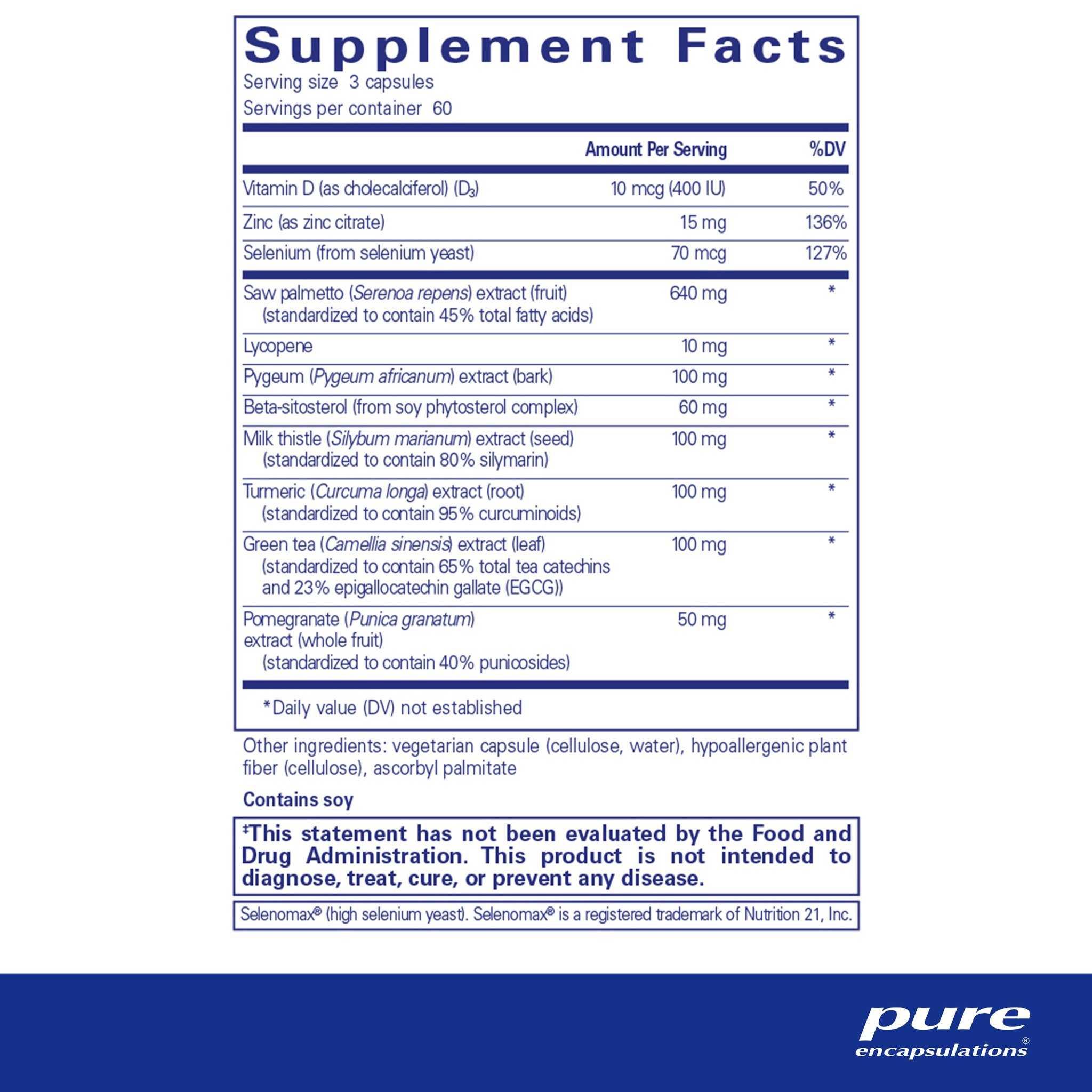 Saw palmetto, pygeum and beta-sitosterol offer support for healthy urinary function, in part by maintaining healthy hormone metabolism and enzyme activities. A meta-analysis involving 18 randomized controlled trials and almost 3,000 men indicated that saw palmetto provided positive support for urinary health. In a related meta-analysis, pygeum demonstrated similar support. A randomized, double blind, placebo-controlled, multicenter study with 200 male subjects revealed that beta-sitosterol also provides promising urinary function support. These actions are combined with the powerful prostate cell support potential of antioxidants, vitamins, minerals and herbs included in this formula. Data from over 47,000 participants in the Health Professionals Follow-Up Study suggested that tomato or lycopene intake was positively associated with prostate cell health. Healthy plasma concentrations of selenium and zinc have also been associated with maintaining healthy prostate cell metabolism. Vitamin D, curcumin and green tea play key roles in prostate cell health, including support for healthy matrix metalloproteinase (MMP) activity, cell receptor function and cell signaling. Pomegranate and silymarin provide enhanced antioxidant support and promote healthy prostate cell cycle function.*